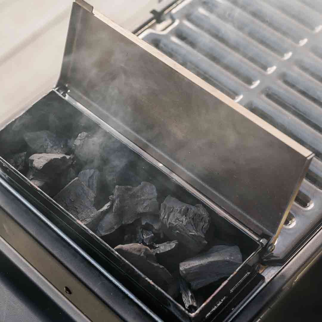 De Charcoal MiniHopper™ houdt 700 g briketten of 450 g kleine brokken vast voor wel 4 uur gebruik, terwijl de opvouwbare QuickCollapse™-kar het transport en de opslag vereenvoudigt. De zijladen bieden extra bereidingsruimte, en de bekerhouders voegen extra gemak toe.